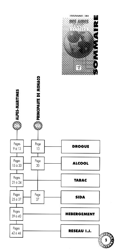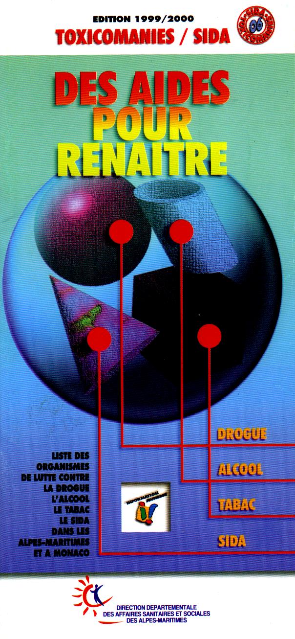 Cette brochure, édition 1999/2000 est une mise à jour de "Une aide pour mieux cibler nos combats"(1998). Elle sannonce comme la "liste des organismes de lutte contre la drogue, lalcool, le tabac, le sida dans les Alpes-Maritimes et à Monaco". Le sommaire présente dans cet ordre les adresses des lieux recensés. Chaque rubrique de présentation dune structure cite son organisation administrative (association par exemple), la composition de léquipe, ses missions ou buts, le public auquel elle sadresse, les modalités daccès. Une note de type N.B. relève loriginalité de la structure si nécessaire. Par exemple : lassociation possède un véhicule qui permet de visiter les malades, mention dautres centres ou lieux gérés par la structure ou autres antennes dans la région. En fin de plaquette figurent les autres adresses du Réseau Information Jeunesse du département des Alpes-Maritimes. Brochure utile, de format pratique, très facile à feuilleter, de qualité graphique, bien présentée.