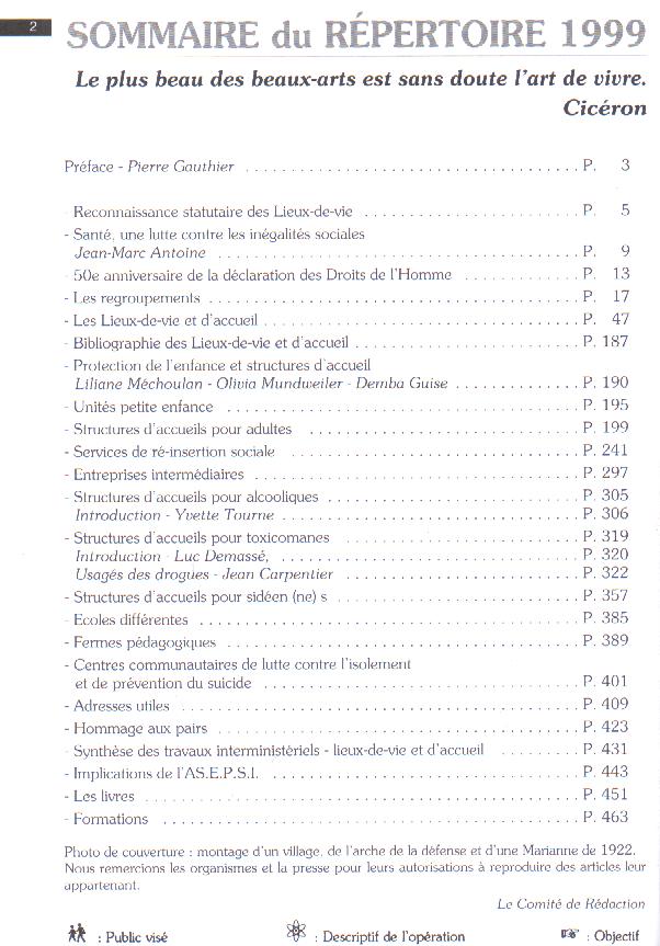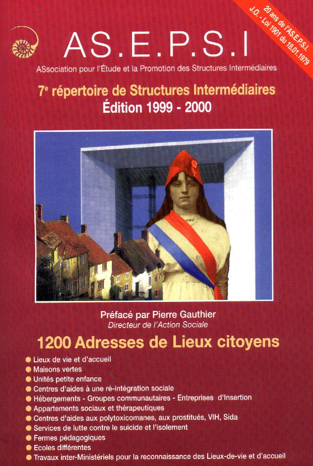 A l'occasion du 20e anniversaire de l'association, L'ASEPSI édite son 7e répertoire dans cette série. 1200 adresses de lieux citoyens sont recensées : lieux de vie et d'accueil ; maisons vertes ; unités petite enfance ; centres d'aides à une ré-intégration sociale ; hébergements-groupes communautaires-entreprises d'insertion ; appartements sociaux et thérapeutiques ; centres d'aides aux polytoxicomanes, aux prostituées, Vih, Sida ; services de lutte contre le suicide et l'isolement ; fermes pédagogiques ; écoles différentes ; travaux inter-ministériels pour la reconnaissance des lieux de vie et d'accueil.
